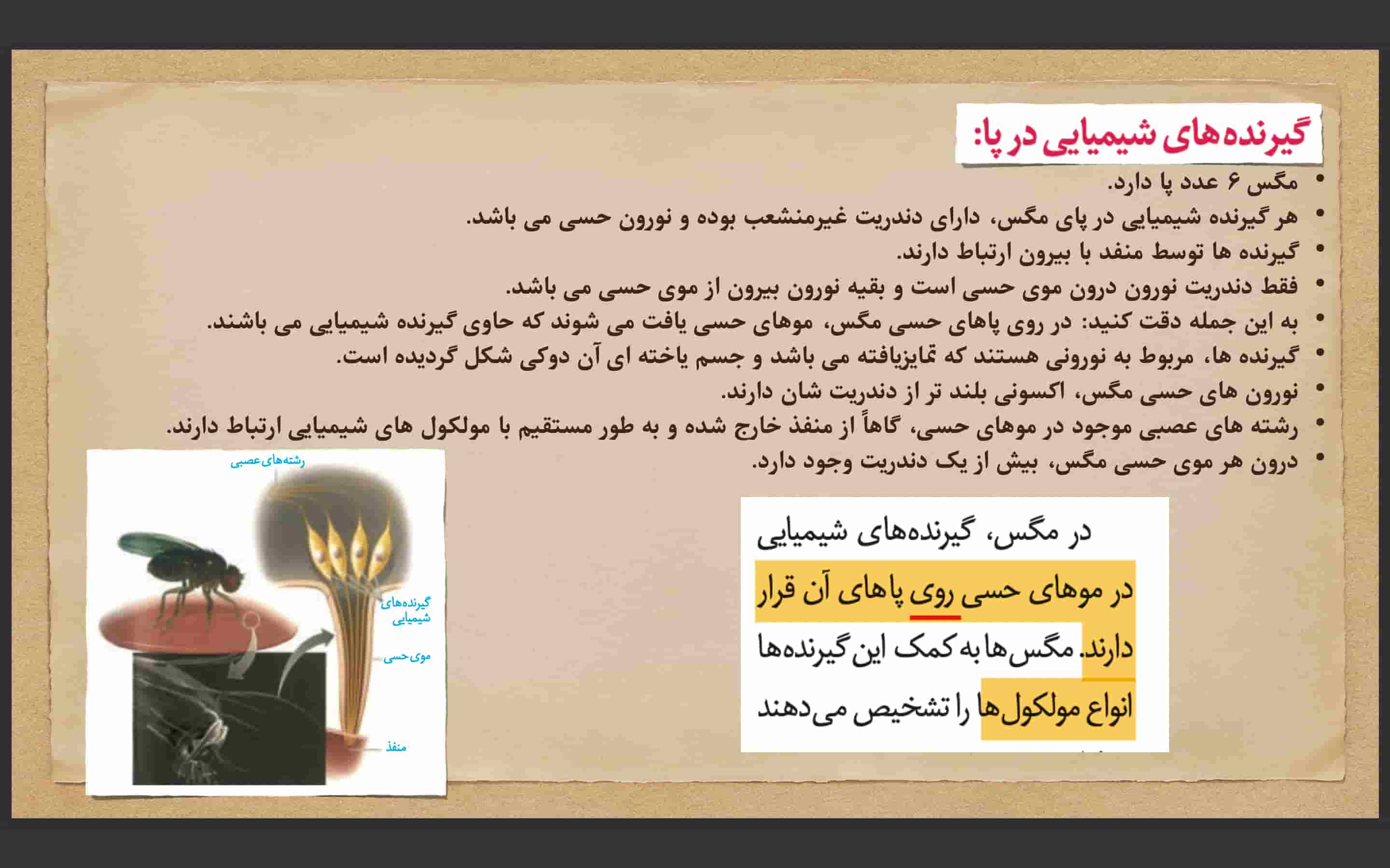 نمونه نکته۴ـ فقط دندریت نورون درون موی حسی است و بقیه نورون بیرون از موی حسی می باشد.