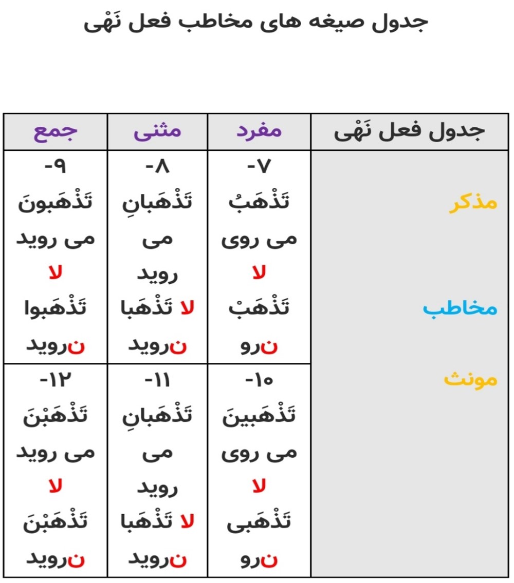 2- سپس آخر آن را مجزوم می کنیم ؛ یعنی اگر آخر آن حرکت داشت آن را ساکن می کنیم و اگر نداشت آن را حذف می کنیم، به جز صیغه 12 که تغییر نمی کند.