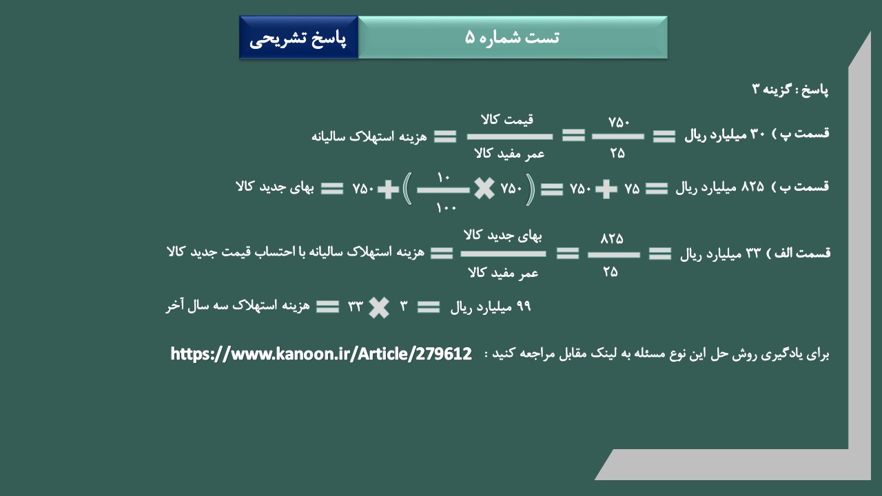 در یک جامعه فرضی یک دستگاه کالای سرمایه ای با عمر مفید 25 سال را به قیمت 750 میلیارد ریال خریداری کرده ایم .