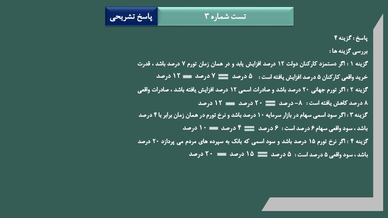 4. اگر نرخ تورم 15 درصد باشد و سود اسمی که بانک به سپرده های مردم می پردازد 20 درصد باشد ، آنگاه سود واقعی 5 درصد است