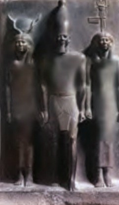 نکته: در بعضی تندیس ها حضور شخصیتها و نمادهای آسمانی چون الاهگان نگهبان تاکید مضاعف بر قدرت خدایی فراعنه است. مثال: شاه منکورع در میان دو الهه نگهبان.