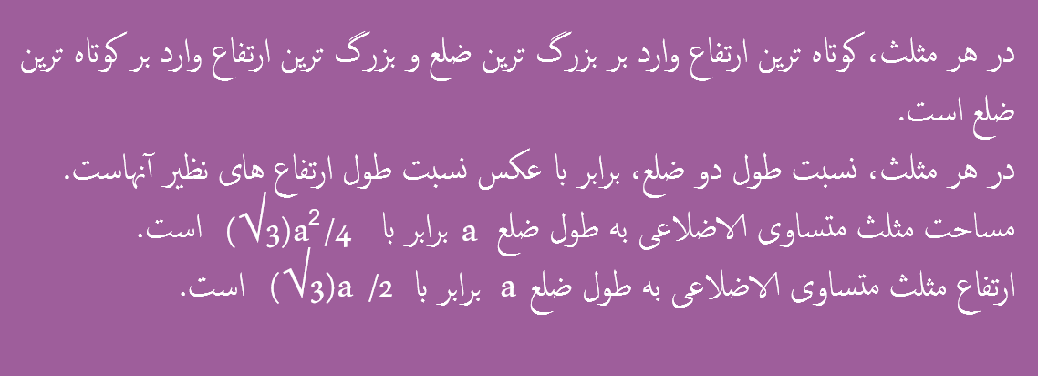 در هر مثلث اگر از نقطه همرسی میانه ها به سه راس مثلث وصل کنیم، سه مثلث با مساحت برابر به وجود می آیند.