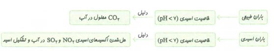 باران طبیعی به دلیل وجود کربن دی اکسید محلول در آن، اندکی اسیدی و دارای pH کمتر از ۷ است، اما برخی آلاینده های هوا مانندNO, SO که اکسید اسیدی هستند، می توانند با آب و اکسیژن موجود در هوا واکنش دهند و در نهایت به اسیدهای قوی نیتریک اسید HNO3 و سولفوریک اسید H2SO4 تبدیل شوند. این اسیدها به طور قابل توجهی! بر مقدار اسیدی بودن آب باران اضافه می کنند. به این باران، باران اسیدی می گویند. و باران اسیدی آثار جبران ناپذیری بر جنگل ها، باغهای میوه و زندگی آبزیان دارد. هم چنین آثار زیانبار باران اسیدی بر روی پوست، دستگاه تنفس و چشم ها به سرعت قابل تشخیص است و گاهی خاصیت اسیدی آن باعث خشک شدن و ترک خوردگی پوست بدن می شود.