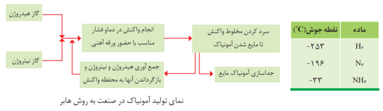 هابر واكنش میان گازهای هیدروژن و نیتروژن را بارها در دماها و فشارهای گوناگون انجام داد تا بتواند شرایط بهینه آن را پیدا كند. سرانجام دریافت که اگر مخلوط این گازها از روی یك ورقه ی آهنی (کاتالیزگر) در دما و فشار مناسب عبور داده شود با انجام واكنش، مقدار قابل توجهی آمونیاك تولید می شود؛ اما همه ی واكنش دهنده ها به فرآورده تبدیل نخواهد شد؛ زیرا این واكنش برگشت پذیر است؛ با این توصیف در ظرف واكنش مخلوطی از سه گاز هیدروژن، نیتروژن و آمونیاك وجود دارد.