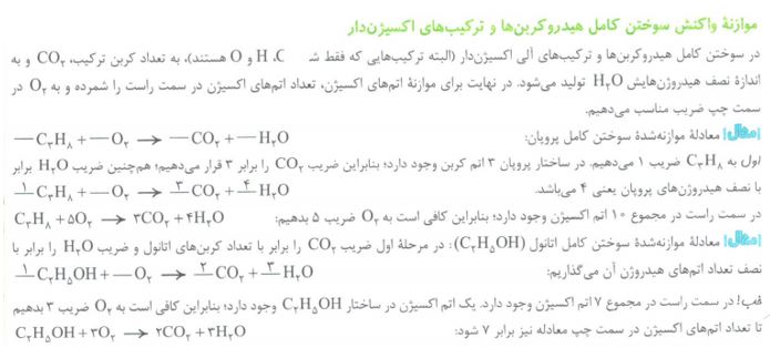 نکته: انواع فرآورده ها در واکنش سوختن سوخت های فسیلی علاوه بر ماهیت ماده سوختنی به مقدار اکسیژن در دسترس نیز بستگی دارد به طوری که اگر اکسیژن کافی داشته باشد سوختن کامل انجام می گیرد و گاز کربن دی اکسید و بخار آب تولید می شود در این حالت رنگ شعله آبی است اما اگر مقدار اکسیژن کم باشد گاز کربن دی اکسید و یا دوده نیز به همراه سایر فراورده ها تولید می شود و رنگ شعله زرد رنگ خواهد شد یعنی سوختن ناقص انجام می گیرد.