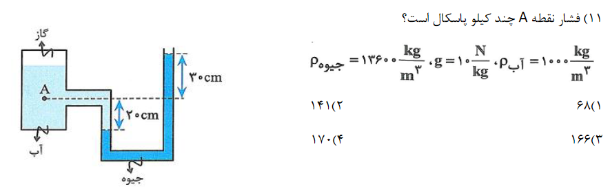 فشار کل وراد بر کف یک ضرف از طرف آب داخل آن 102 کیلو پاسکال است . اگر مساحت کف ظرف 250 باشد : ( چگالی آب و جیوه به ترتیب 1000 و 13600 و فشار هوا پاسکال است . )