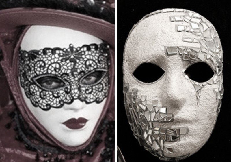 الف) صورتک نیمه ← از پیشانی تا روی لب را میپوشاند (در نمایش کمدیادلارته از این صورتک استفاده می شود).