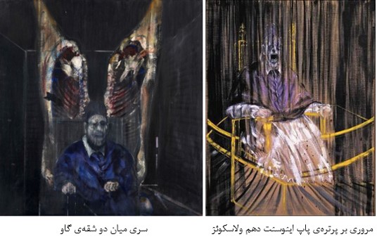 بیکن غالباً فکر اولیهی نقاشیهایش را از عکسهای رادیوگرافی، تصاویر سلسلهوار، فیلمهای سینمایی و غیره برمیگرفت. او آخرین مفسر برجستهی اضطراب انسان غربی به زبان نقاشی نو است. صحنههای تنگ و تاریک، کژنمایی در چهره به منظور طبعآزمایی مخاطب و سعی در نشان دادن ماهیت سیاه در راستای سرکوب مخالفان هنر مدرن از ویژگیهای آثار او میباشند.