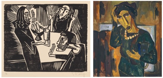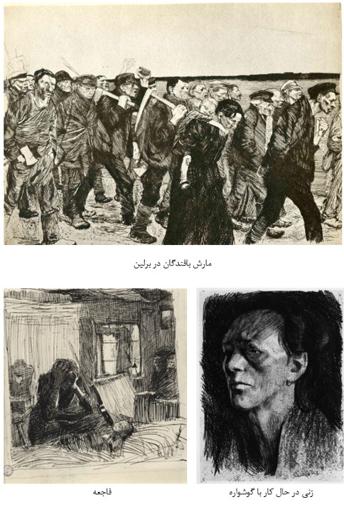 او در توصیف حالتهای عاطفی و فاجعهآمیز (البته نه در سبک و طرز دید) با اکسپرسیونیستها قرابت داشت. تجربهی زندگی در محلهی فقیرنشین این شهر، بهترین طراحیها و باسمههای شاخصش را در مضمونهای مادر و بچه، نابسامانیهای اجتماعی، کار و مبارزه تهیدستان به بار آورد. در سالهای آخر زندگانی دست به ساختن مجسمههای مفرغین زد که مهمترین آنها یادمان جنگ است.