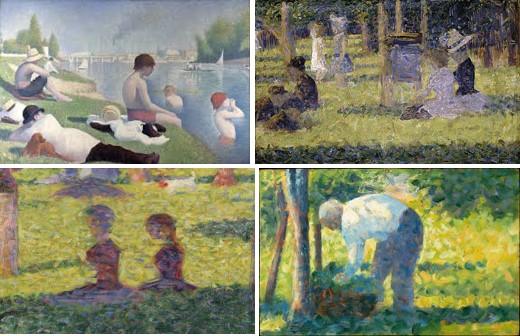جورج سورا: تفکیک نور و رنگ تجلی شده در شکل نقطه های رنگین(تجزیه گری رنگ یا نقطه پردازی).اهمیت سورا تنها در شیوه رنگ آمیزی او نیست بلکه آگاهی از اهمیت فرم و اعتدال در ترکیب بندی به آثار اوارزش ویژه داده است.