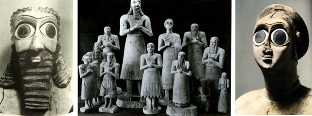 مجسمه های سومری حالتی واقعگرا و در عین حال خشک و رسمی و ایستا و پرصلابت با دامنهای چین دار و دست های تاخورده بر سینه به نشانه نیایش با چشمانی درشت و مردمکی با سنگهای رنگین اجرا می شد. اندازه مجسمه های کوچک است در واقع اندازه تندیس ها یکسان نیست. تندیس ها از جنس سنگ مرمر هستند.