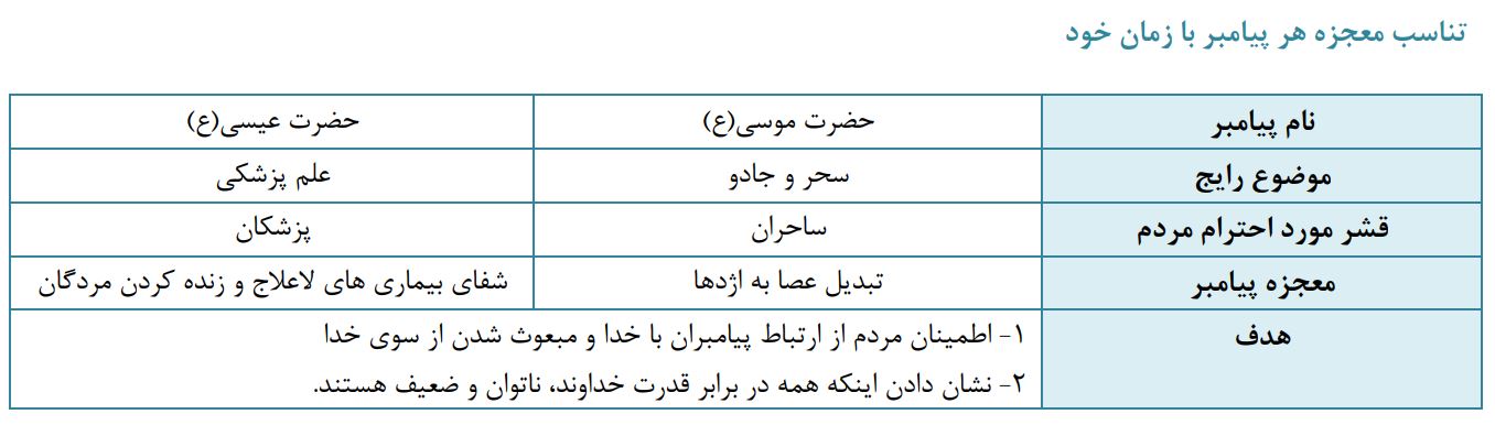 ۵. سومین معجزه حضرت (زنده نمودن مردگان) با موضوع امکان معاد (درس ۵ دین و زندگی دهم) مرتبط است؛ چراکه وقتی پیامبر خدا توانایی زنده کردم مردگان را داشته پس خدا حتما می تواند مردگان را در قیامت زنده کند.