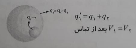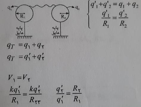 - اگر دو کره فلزی را به یکدیگر توسط یک رسانا متصل کنیم این دو کره هم پتانسیل میشوند و بار هر کره بعد از اتصال برابر است با :