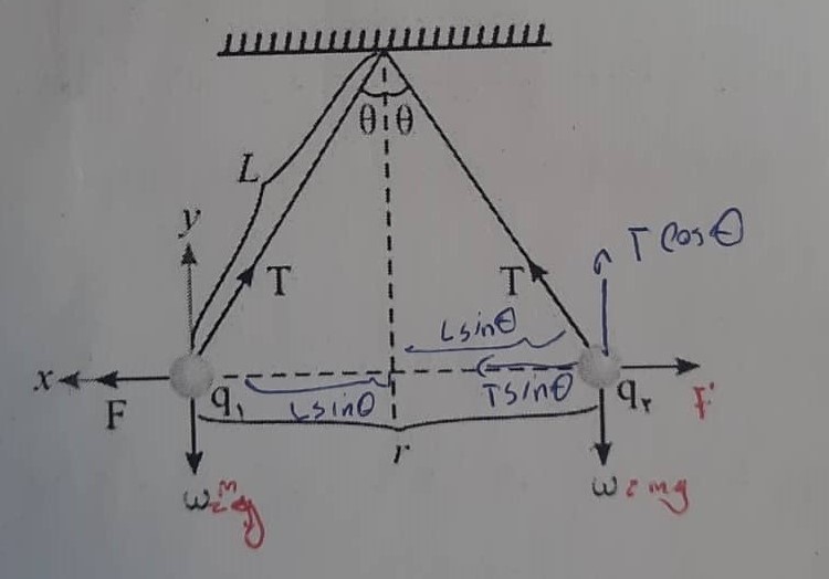 اگر دو کره فلزی را توسط ریسمانی به نقطه ایی ببندیم و به گلوله ها بار یکسانی بدهیم میتوان نوشت :