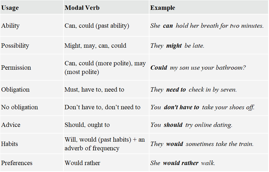 در جدول زیر می توانید انواع Modal Verb را در حالت های مختلف مشاهده فرمایید: