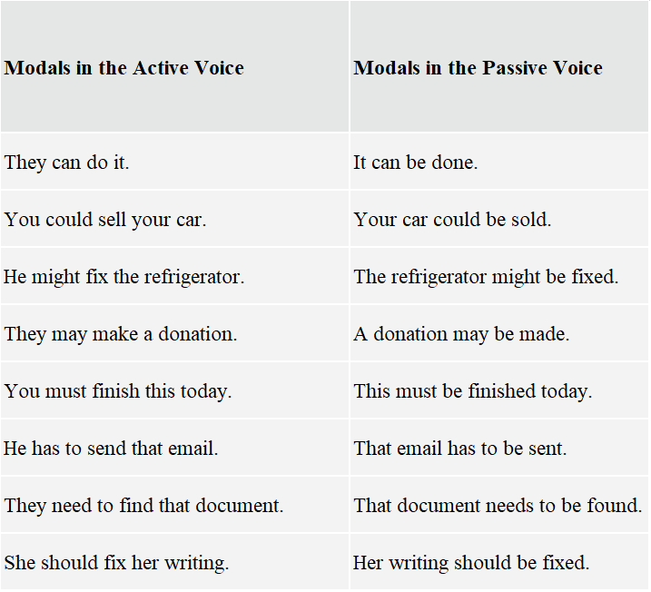 در جدول جمله های مختلف با Modal Verbs در حالت مجهول به کار رفته است: