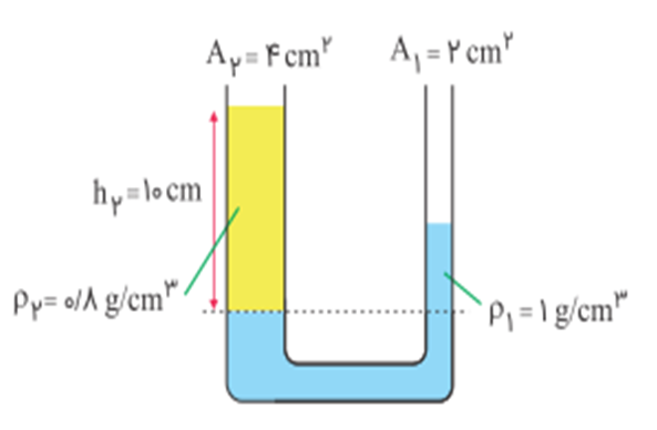 سوال3 - در شکل زیر مساحت مقطع لولۀ شکل در سمت چپ 2 برابر مساحت مقطع لوله در سمت راست است. چند سانتیمترمکعب از مایعی به چگالی 0.9 گرم بر سانتی متر مکعب به شاخۀ طرف راست اضافه کنیم تا سطح مایعها در دو طرف لوله همتراز شود؟ آزمون های کانون