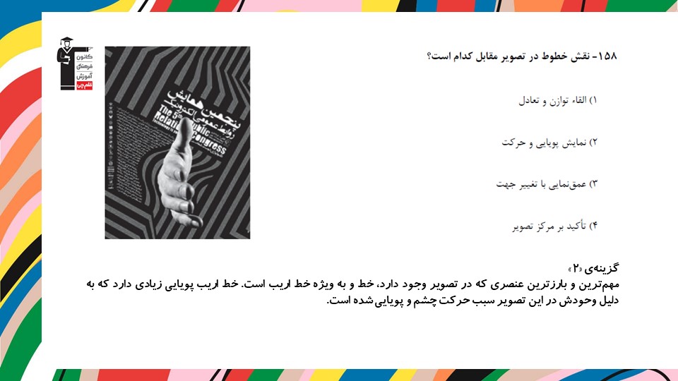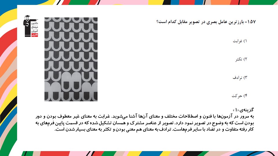 نکتهی مهمی که باید یادآور شم اینه که به آزمون دیدی آموزشی داشته باشید. تمامی تصاویر و سوالاتی که در آزمون میبینید برای تمرین و آموزش نکات مهم به شما تهیه میشن، پس اگر درصد پاسخگوییتون کمه نگران نباشید و سوالات آزمون و آزمون غیرحضوری رو با پاسخ تشریحی مرور کنید تا نحوهی تحلیل تصویر رو یاد بگیرید.