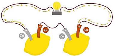 • یکی از راه های بهرهگیری از انرژی ذخیره شده در فلزها، اتصال آن ها در شرایط مناسب به یکدیگر است. برای نمونه با یک تیغه مسی و تیغهای دیگر مانند روی و با میوهای مانند لیمو میتوان نوعی باتری ساخت و با آن یک لامپ LED را روشن کرد که در آن روی نقش آند و مس نقش کاتد را ایفا می کند. ساختار این باتری ها به صورت زیر است:
