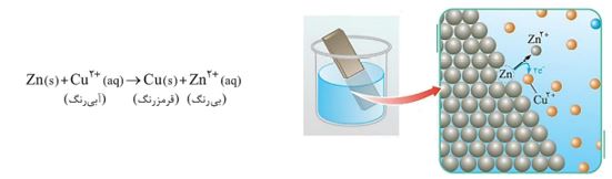 •تمایل فلزها برای از دست دادن الکترون در محلول های آبی یکسان نیست . به دیگر سخن فلزها قدرت کاهندگی متفاوتی دارند. برای نمونه فلز روی کاهنده تر از مس است. در واکنشهایی از این دست که خود به خود انجام میشوند، مخلوط واکنش گرمتر میشود زیرا سامانۀ واکنش بخشی از( نه همه) انرژی خود را به شکل گرما به محیط می دهد. به عنوان مثال، واکنش میان محلول مس(II) سولفات با فلز روی به صورت زیر است: