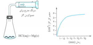 در یک ظرف شیشه ای دارای mL 100 محلول mol.L-1 0.06 هیدروکلریک اسید که دهانهء آن به یک سرنگ استوانه ای به قطر cm2 متصل است، یک تکه نوار منیزیم با جرم معین انداخته می شود. برای انجام نیمی از این واکنش، به چند ثانیه زمان نیاز است و در این هنگام، پیستون چند cm نسبت به محل اولیهء خود جابه جا می شود؟ (حجم مولی گاز در شرایط آزمایش برابر L20 و π = 3 فرض شود، Mg=24g.mol-1)