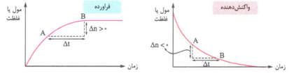 * در یک واکنش، نمودار، «مول یا غلظت – زمان» مربوط به فرآورده ها صعودی و نمودار «مول یا غلظت – زمان» مربوط به واکنش دهنده ها نزولی است.