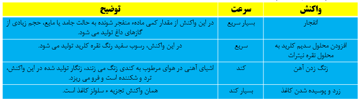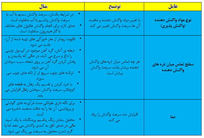 نکته: هرچه سطح جامدات کوچک تر باشد سرعت انجام واکنش بیش تر است.