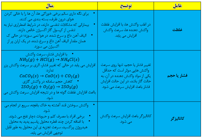 نکته: در واکنش هایی که حداقل یکی از واکنش دهنده ها گازی باشد تغییر فشار، سرعت انجام واکنش را تغییر خواهد داد.