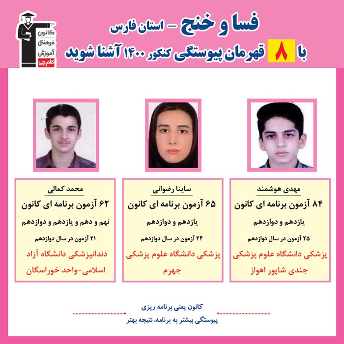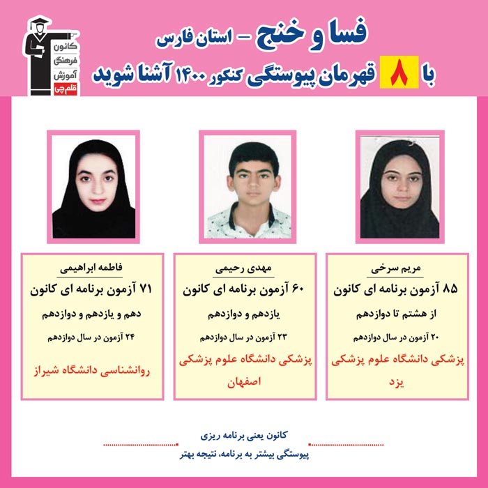 با 8 نفر قهرمانان پیوستگی فسا و خنج در کنکور 1400 آشنا شوید