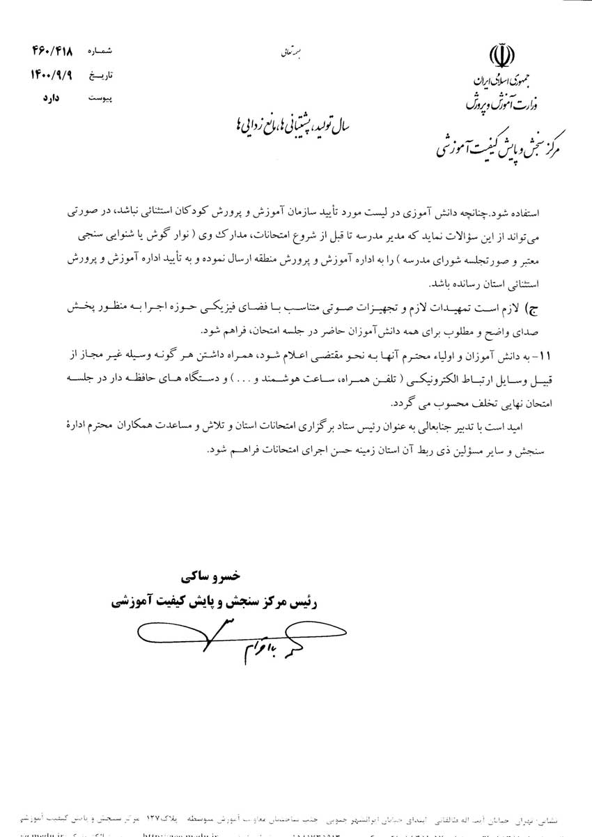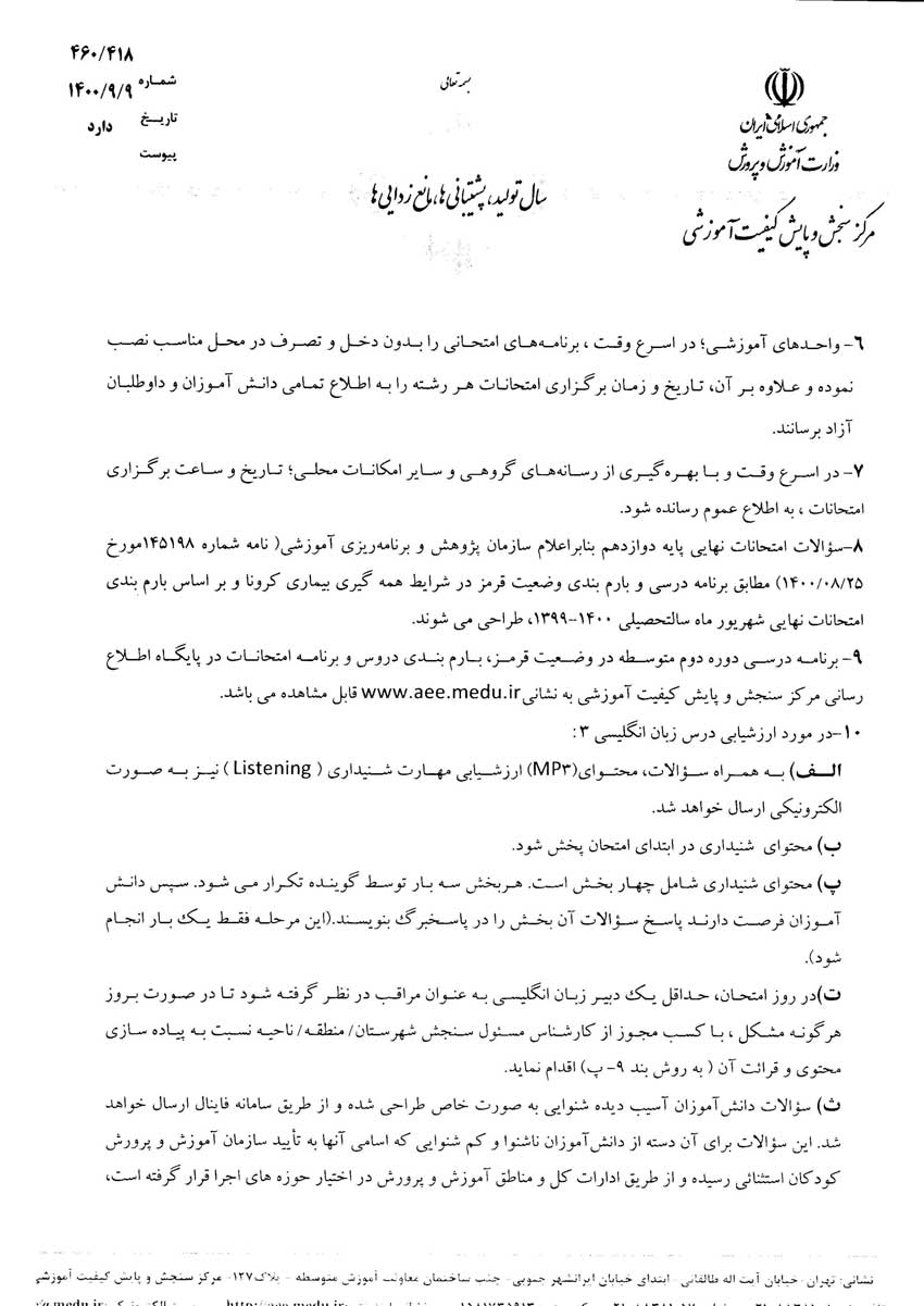 مرکز سنجش و پایش کیفیت آموزشی وزارت آموزش و پرورش، برنامه امتحانات نهایی پایه دوازدهم در نوبت امتحانی دی ماه ۱۴۰۰ را منتشر کرد.