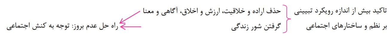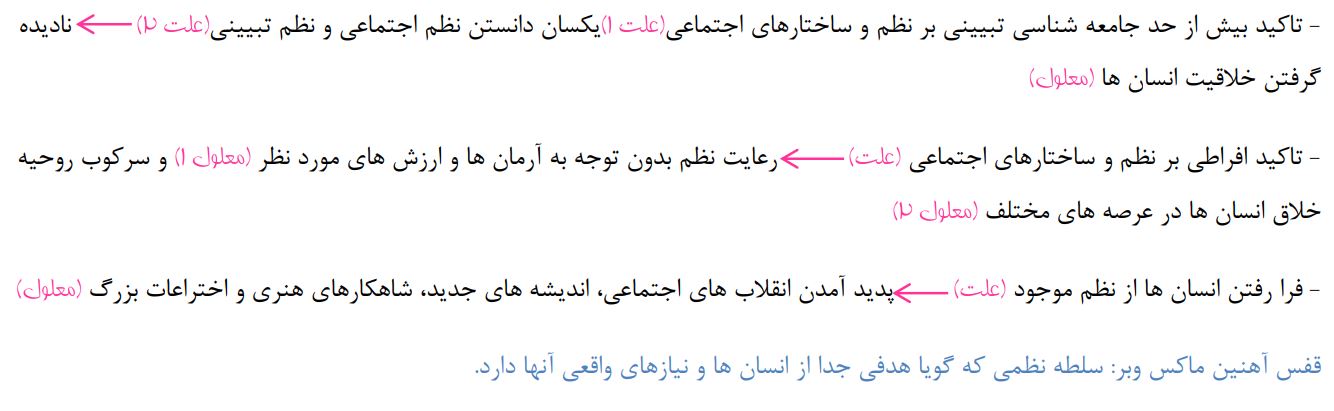 گزینه ۲ ؛ تاکید افراطی بر نظم اجتماعی، به تدریج سبب می شود که افراد بدون اینکه بدانند این نظم برای تحقق چه اهداف و آرمان ها و ارزش هایی است، صرفا آن را رعایت کنند.