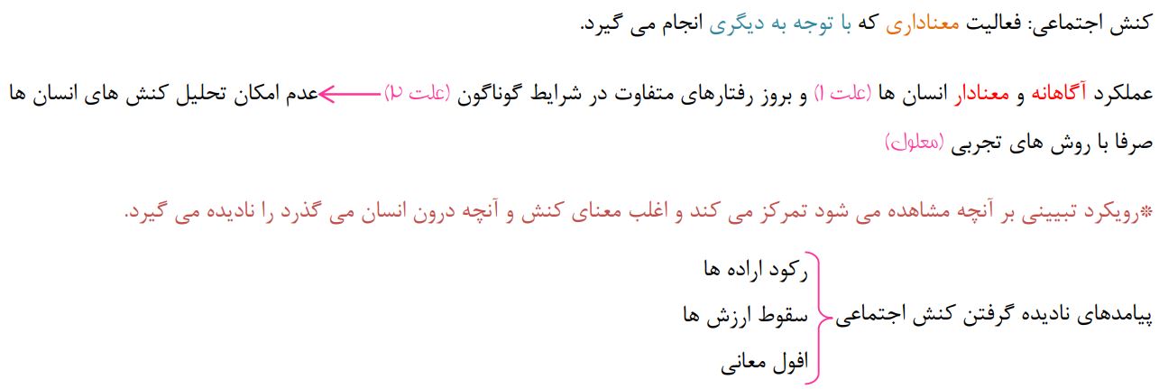 گزینه ۴ ؛ تشریح عبارت نادرست: هموار شدن مسیر برای عبور از جامعه شناسی تبیینی و روی آوردن به جامعه شناسی تفسیری، پیامد تاکید بر آگاهی و معناست.