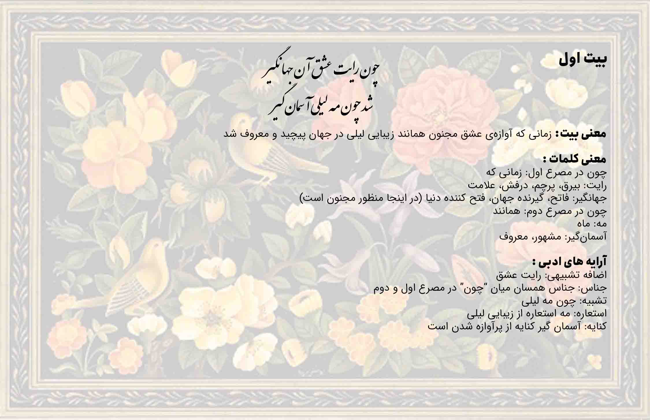 4 ) چون رایت عشق آن جهان گیر / شد چون مه لیلی آسمان گیر