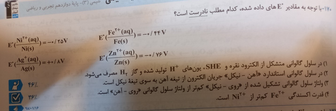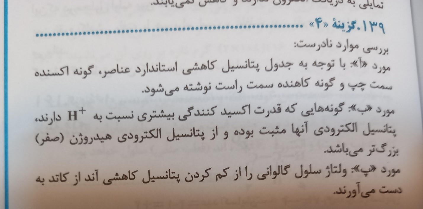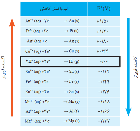 نکته 2: هر چه عنصری در موقعیت پایین تری از جدول باشد(°𝐸 منفی تر)گونه سمت راست(فلز خنثی) تمایل بیشتری به از دست دادن الکترون دارد و قدرت کاهندگی (تمایل به اکسایش)در آن بیشتر است.