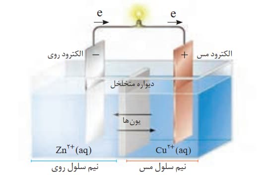 نکته: از طریق دیواره متخلخل کاتیون ها به سمت کاتد و آنیون ها به سمت آند حرکت می کنند تا حالت خنثی در هر دو نیم سلول حفظ شود.