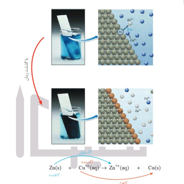 276- هرگاه تیغه ای از جنس روی درون محلول مس II سولفات آبی رنگ قرار گیرد،به تدریج از شدت رنگ محلول کاسته میشود.این تغییر رنگ نشان دهنده انجام واکنش شیمیایی زیر است: