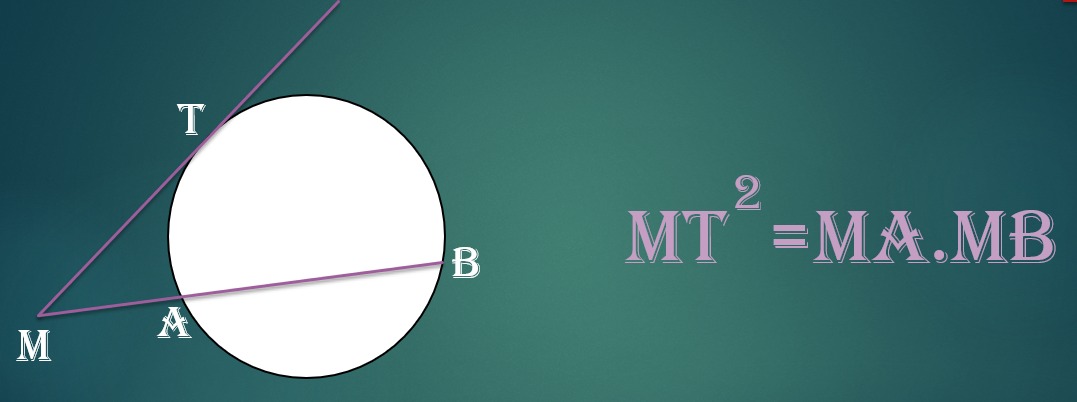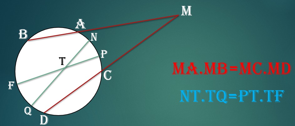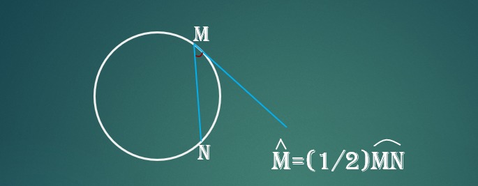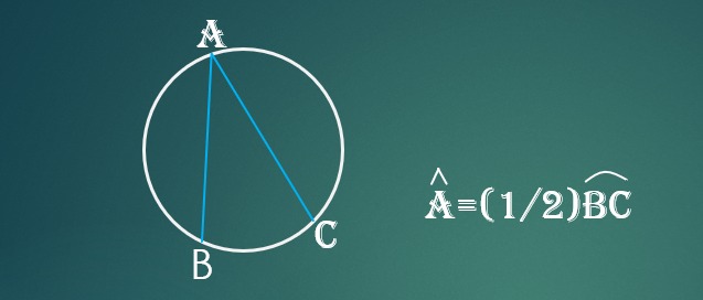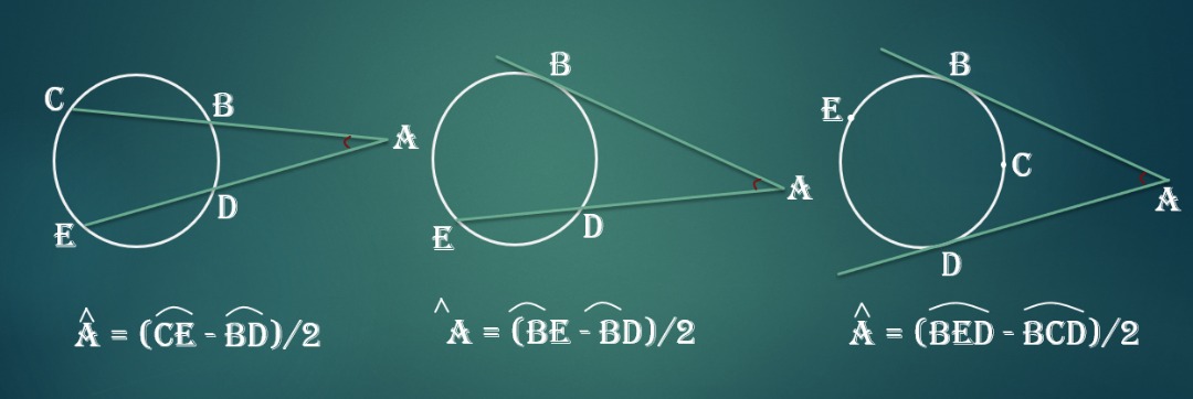 زاویه بین امتداد دو وتر دایره که در خارج دایره متقاطع اند (هم چنین زاویه بین امتداد یک وتر و یک مماس و نیز زاویه بین دو مماس، مساوی با نصف قدر مطلق تفاضل دو کمان است.