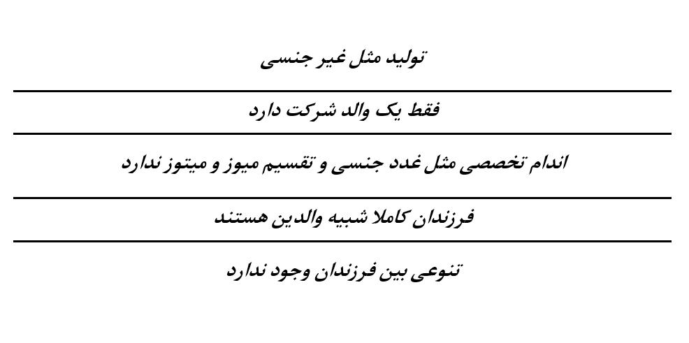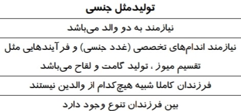 ٣ -در توليد مثل جنسي، ويژگي هاي هريك از والدين توسط دستورالعمل هايي كه در دناي موجود در گامت ها (كامه ها) قرار دارد، به نسل بعد منتقل ميشود. تنوعي بين فرزندان وجود ندارد | بين فرزندان تنوع وجود دارد