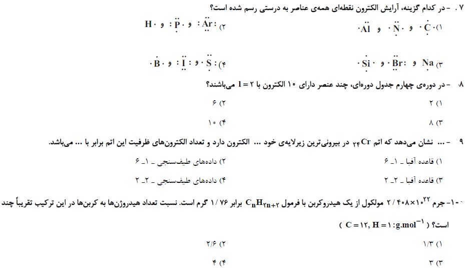 10 سوال شیمی دهم که در ادامه برای شما قرار دادیم، جمع بندی مباحث آزمون 19 آذر بوده و برای آمادگی بیشتر شما در این آزمون توسط فاطمه احدزاده رتبه 373 رشته ریاضی سال 95 انتخاب و برای شما قرار داده شده است. بعد از مطالعه ی کتاب درسی و درسنامه های آمادگی آزمون 18 آذر، توصیه میکنم حتما این سوالات را حل کرده و جواب های خود را با پاسخنامه بررسی کنید.
