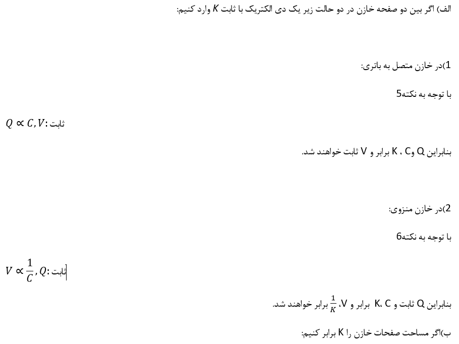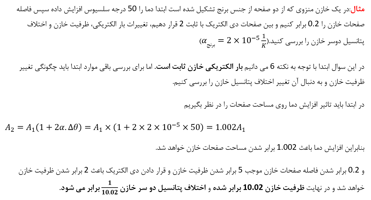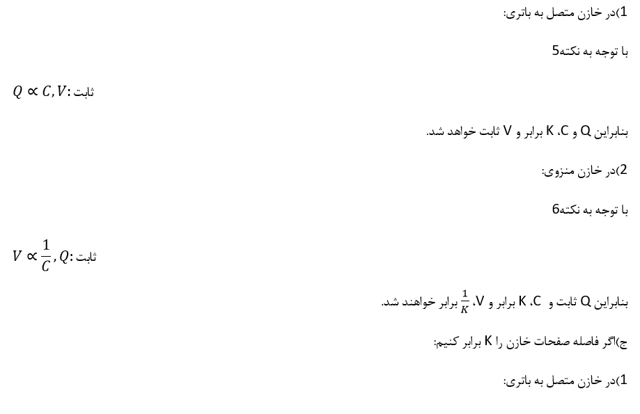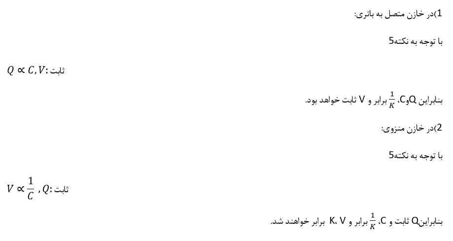 نکته5:در یک خازن با صفحه های متصل به پایانه های یک باتری،اختلاف پتانسیل دو سر خازن ثابت است، بنابراین هر تغییری در ظرفیت خازن باعث می شود بار خازن به همان نسبت تغییر کند.
