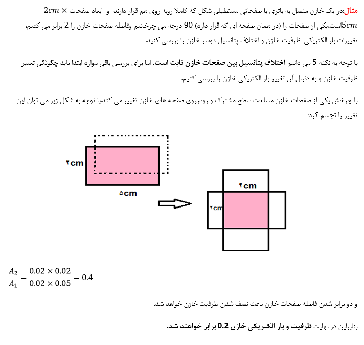 نکته4:منظور از A در رابطه فوق مساحت سطح مشترک و رودرروی صفحه های خازن است. مثال: