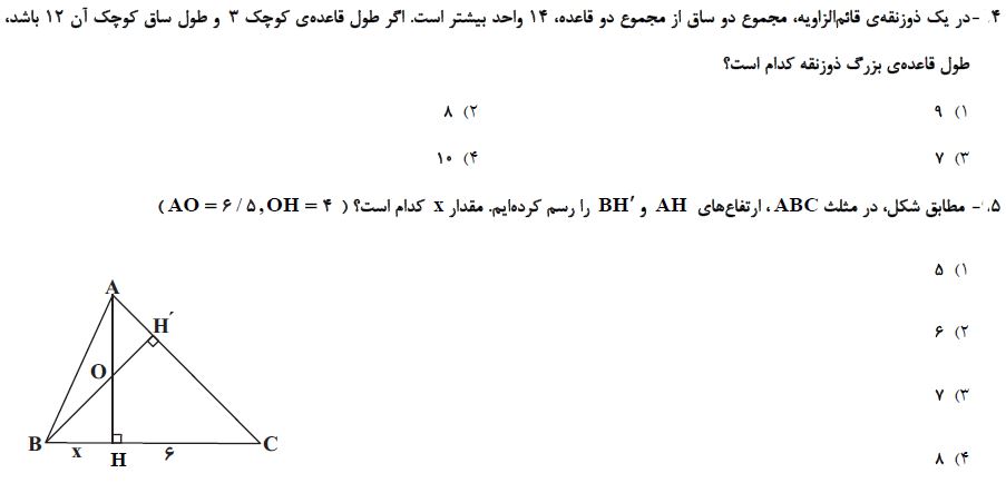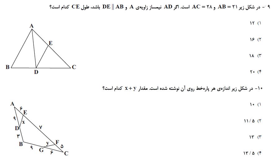 10 سوال هندسه دهم که در ادامه برای شما قرار دادیم، جمع بندی مباحث آزمون 2 دی بوده و برای آمادگی بیشتر شما در این آزمون توسط فاطمه احدزاده رتبه 373 رشته ریاضی سال 95 انتخاب و برای شما قرار داده شده است. بعد از مطالعه ی کتاب درسی و درسنامه های آمادگی آزمون 2 دی، توصیه میکنم حتما این سوالات را حل کرده و جواب های خود را با پاسخنامه بررسی کنید.