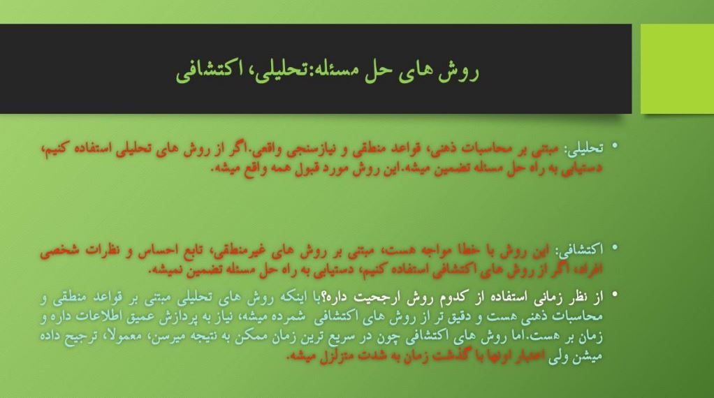 🟢 یه نکته مهم:توی حل هر مسئله ای بهتره اول از روش های تحلیلی استفاده کنید و بعد اگر نتیجه بخش نبود، از روش های اکتشافی استفاده کنید و بعد از استفاده از روش های اکتشافی، برای اطمینان صد در صدی به سراغ روش های تحلیلی برید.
