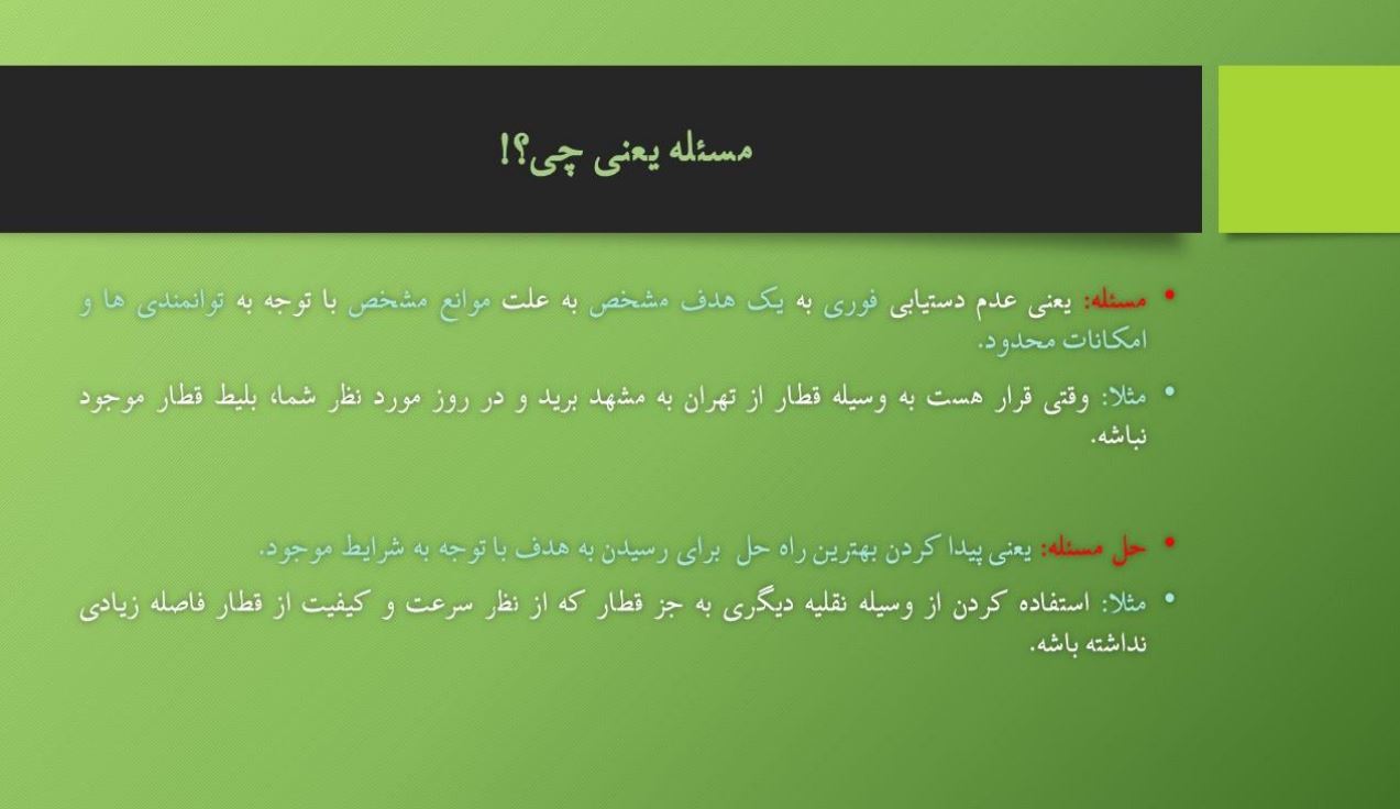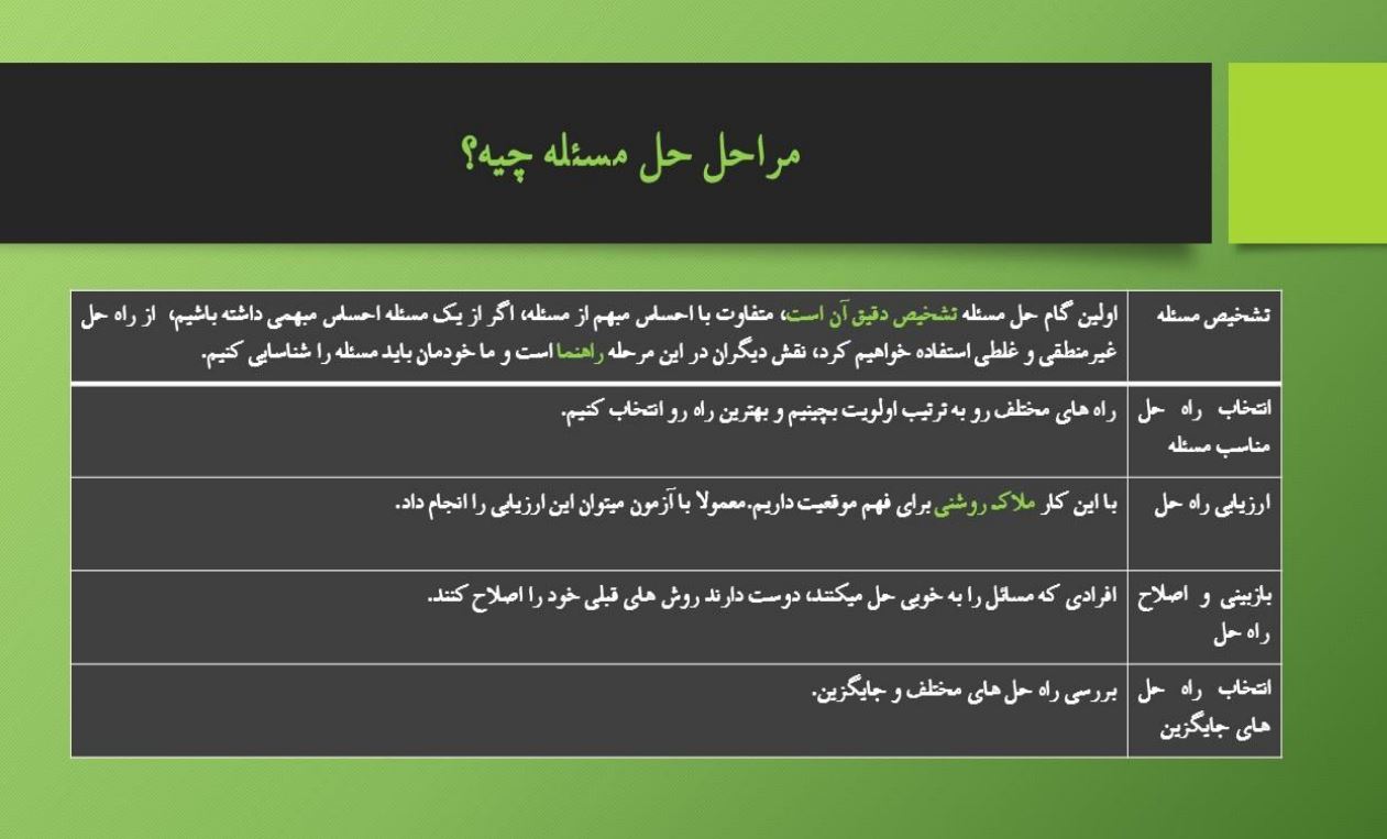 🟢 کلمه "مسئله" برای بسیاری از مردم بار معنایی منفی داره.چون در اصل، اونها روش درست حل یک مسئله رو نمیدونن.