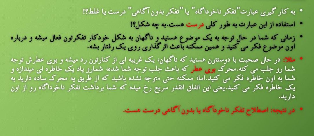 🟢 یک نکته مهم : تفکر کاملا آگاهانه است.به این معنی که اگر شما در حال فکر کردن درباره موضوعی باشید، علاوه بر اینکه کاملا متوجه اید که دارید از اطلاعات قبلی که وارد حافظه تون شده استفاده می کنید، به موضوعی که درباره اون فکر می کنید به علاوه روش تفکر خودتون هم توجه دارید و از آن آگاهی دارید.