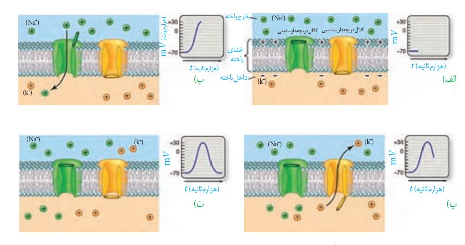 در غشای یاخته های عصبی پروتئین هایی به نام کانال های دریچه دار وجود دارند که با تحریک یاخته عصبی باز می شوند ویون ها از آن عبور می کنند.وقتی غشای یاخته تحریک می شود,ابتدا کانالهای دریچه دار سدیمی باز می شوند و یون های سدیم فراوانی وارد یاخته و بار الکتریکی درون آن مثبت تر می شود. پس از زمان کوتاهی این کانال ها بسته می شوند و کانال های دریچه دار پتاسیمی باز و یون های پتاسیم خارج می شوند.این کانال ها هم پس از مدت کوتاهی بسته می شوند.به این ترتیب دوباره پتانسیل غشا به پتانسیل آرامش(70-) بر می گردد.