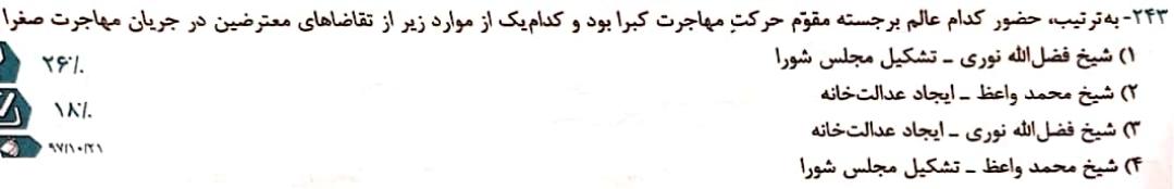 گزینه 3 _حضور شیخ فضل الله نوری به همراه سایر علمای برجسته در مهاجرت کبری بر قوت و استحکام قیام افزود و همچنین ایجاد عدالتخانه ها مورد تقاضای انقلابیون در جریان مهاجرت صغرا بود.