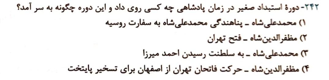 گزینه 1 _دوره استبداد صغیر در زمان پادشاهی محمدعلی شاه روی داد و با پناهندگی محمدعلی شاه به سفارت روسیه،دوره استبداد صغیر به سر آمد.
