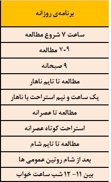 برنامه مطالعاتیم به این صورت بود و نکته مهم برای خودم این بود که اصلا تغییری در طی سال در آن ایجاد نکردم و یکی از مهمترین عوامل موفقیتم را همین نظم می دانم