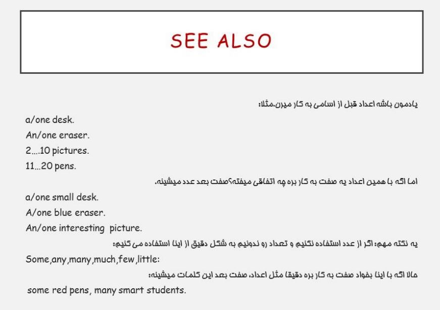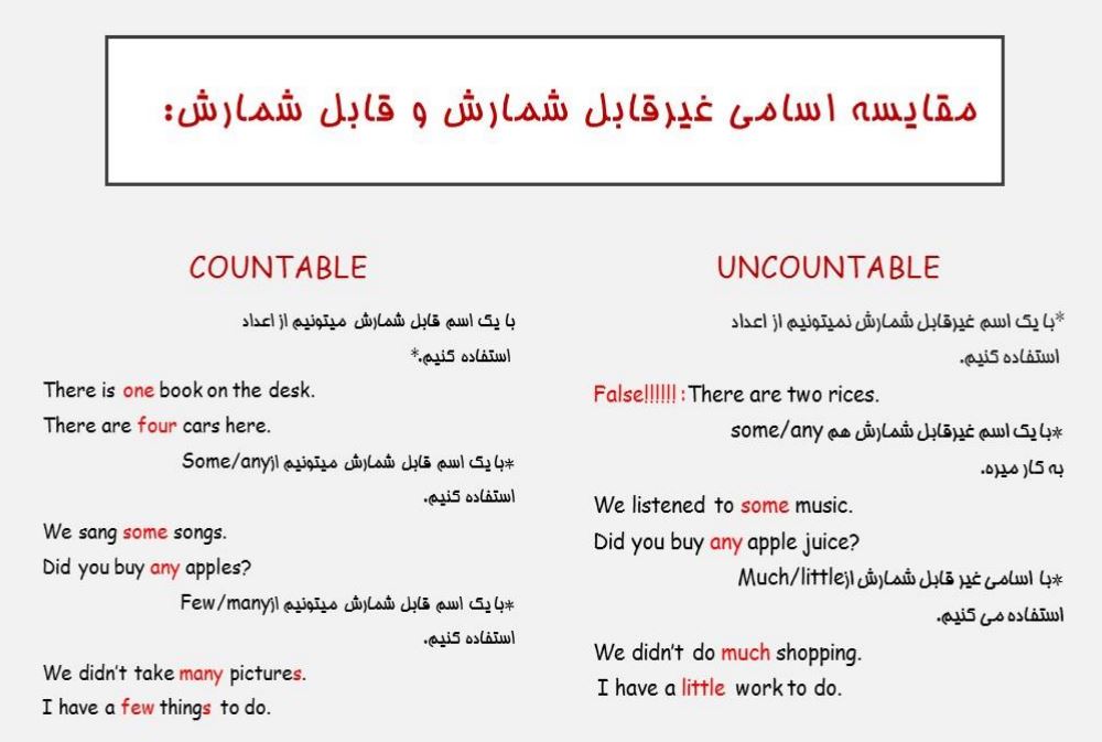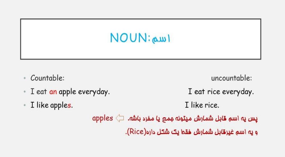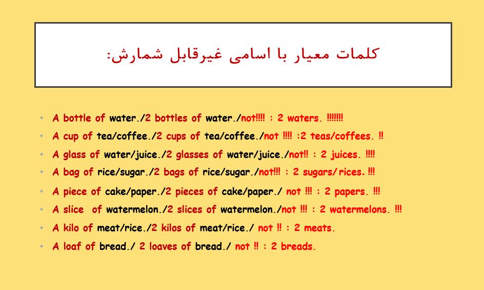 همونطور که در صفحه قبل دیدید با اسامی غیرقابل شمارش از S جمع استفاده نمی کنیم.